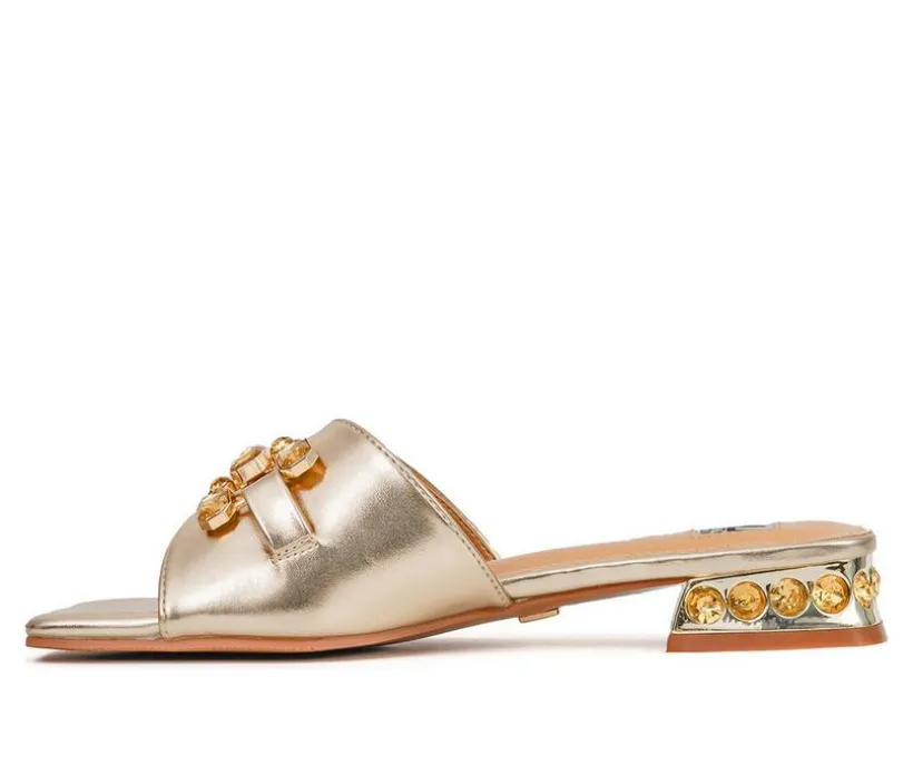 Elevate your glam game with this standout sandal that blends elegance and edge in one easy slide. A broad front band sparkles with bold gemstone embellishments, while the glossy upper and sculpted low heel deliver a luxe, modern vibe. The open toe and slip-on design keep it cool and convenient, perfect for dressing up any look in seconds. Whether you’re headed to an event or out on the town, this chic sandal turns heads with every step.