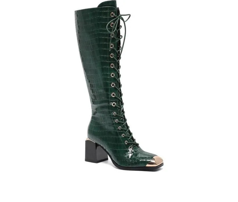 Stand out with these tall boots that combine classic height with bold laced-up styling. The man-made upper rises to just below the knee, detailed with a full lace-up front for striking appeal. A block heel adds a confident lift, while the square-shaped shaft and inside zipper make them easy to wear. A perfect statement piece to pair with dresses, skirts, or skinny jeans.