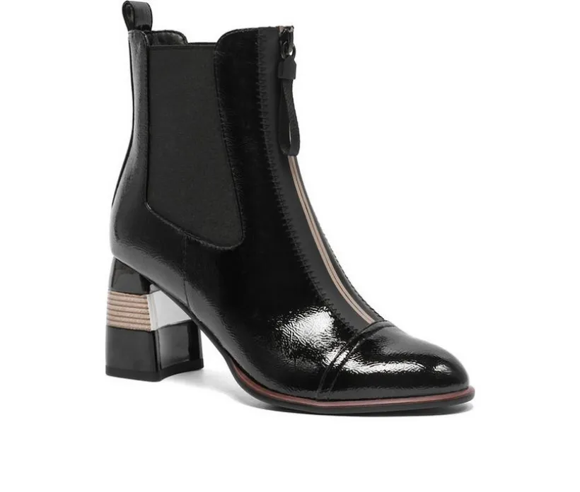 Modern edge meets everyday wear in these ankle boots with a bold front zipper detail. The man-made upper is shaped with a round toe and smooth shaft, while the front zip creates a sleek, fashion-forward finish. A block heel adds height and stability, making these boots versatile enough for both casual and dressy looks.