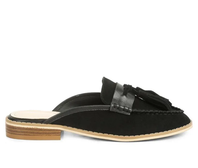 Chic and comfortable, the only two things you need in a shoe which is versatile and appropriate for all occasions. This pair comes with a low wooden heel and tassle detailing and mock stitch detail, which provides an rich dimension to the mules. It is slip on and includes a leather collar lining for extended comfort and luxe look.