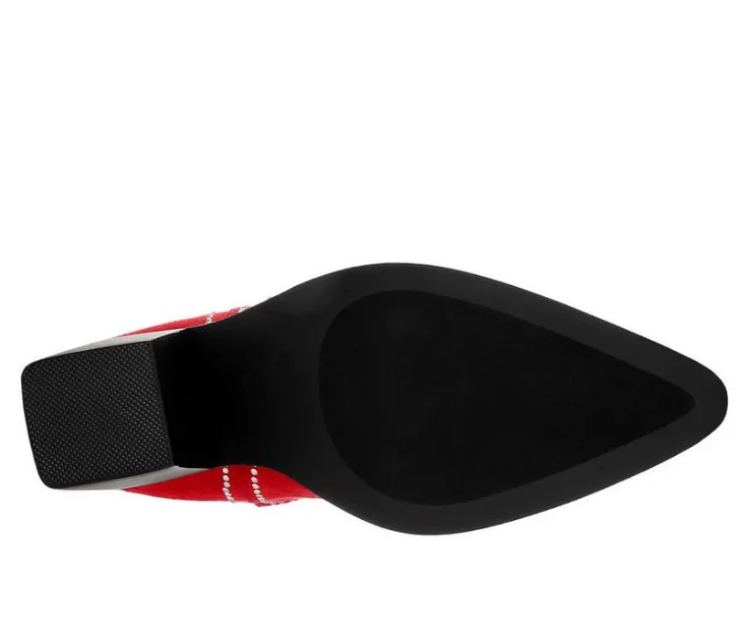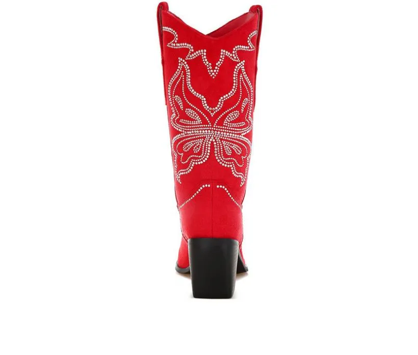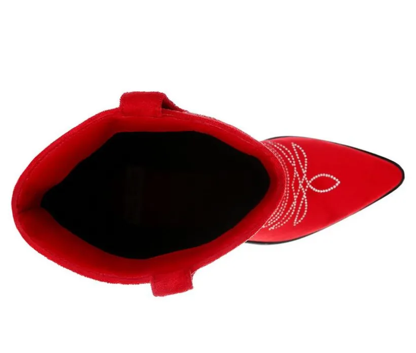 Shimmering rhinestones and western flair come together in these glamorous cowboy boots. The microfiber upper is covered in sparkling patterned rhinestone embellishments, making them a bold standout. A cushioned insole ensures comfort, while the 3″ stacked block heel gives height with stability. Finished with pull tabs and a convenient zipper closure, these boots are equal parts stylish and practical.