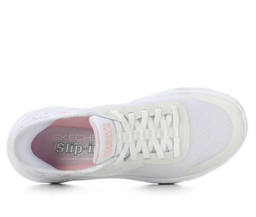 Step-in to convenient walking comfort and cushioning wearing Skechers Hands Free Slip-ins® GO WALK® Flex. Designed with Heel Pillow™, this sporty style features an athletic mesh upper with stretch laces, floral print trim, Skechers Air-Cooled Memory Foam® insole, lightweight ULTRA GO® cushioning, and Flex Pillars™ for added support.