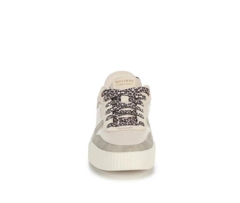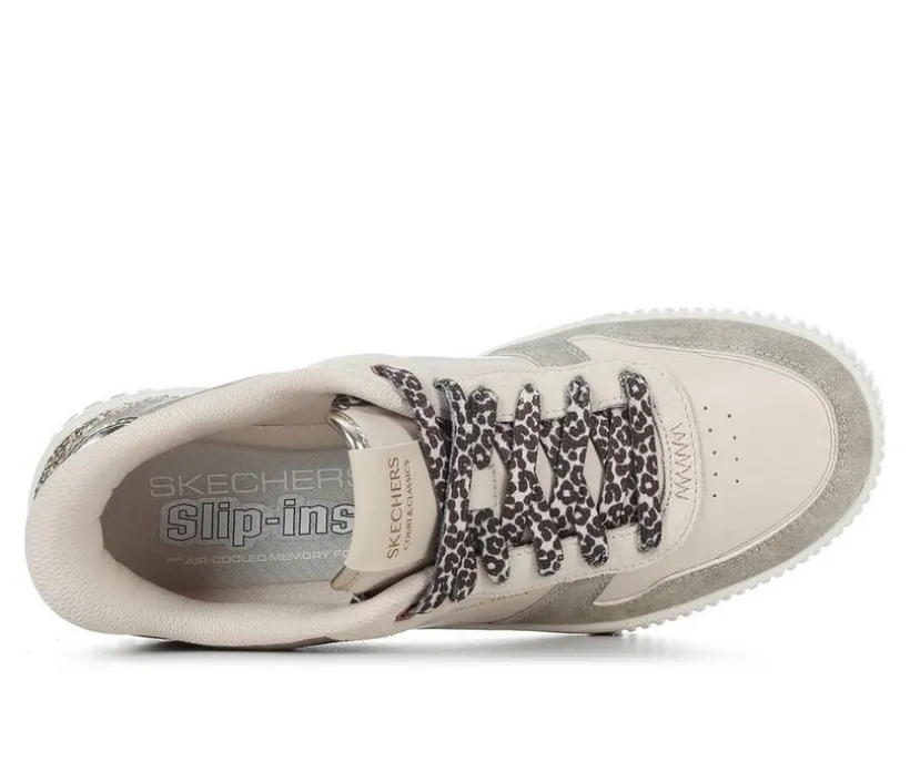 Step into bold style and effortless comfort with the Women’s Skechers Jade Radiant Roar SL. These court-style fashion sneakers feature a duraleather and suede upper adorned with animal print laces, a glittered heel panel, and metallic accents. Designed with Skechers Hands Free Slip-ins® technology and an exclusive Heel Pillow™, they offer a secure fit without the need to bend down. The Air-Cooled Memory Foam® insole ensures cushioned comfort for all-day wear. Please note, due to the presence of metallic and glitter elements, these sneakers are not machine washable.