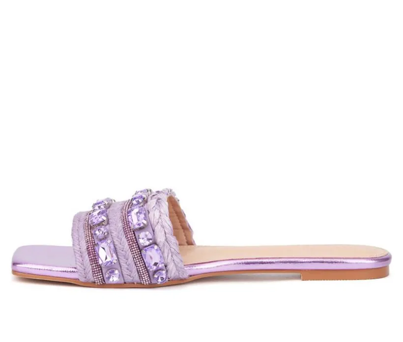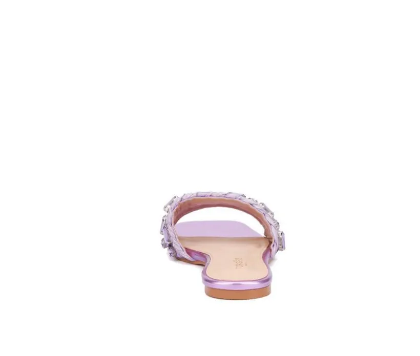 These flat sandals bring a playful and eye-catching twist to warm-weather style. Featuring a single wide strap embellished with colorful beads, rhinestones, and woven accents, they offer a fun, artisanal feel. Perfect for vacation looks, weekend outings, or adding flair to everyday outfits.