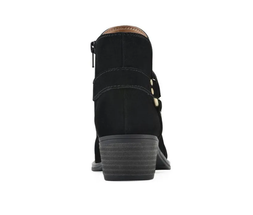Strut in the modern western style of the Altossa bootie from White Mountain Shoes. This bootie is ankle length with a functional inside zipper for easy closure. The harness detailing provides a modern look on a western style bootie.