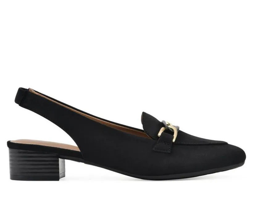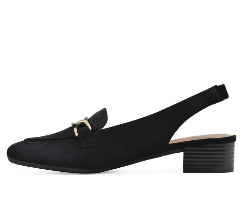 Business in the front and party in the back! The Boreal loafer by White Mountain Shoes has the best of both worlds. This heeled loafer features an almond toe, small metal keeper for a professional look, as well as a casual sling back strap for all day comfort.