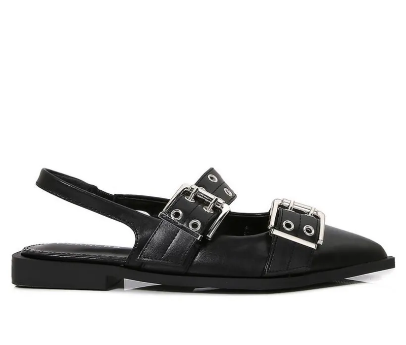 This slingback flat combines sharp tailoring with bold hardware. The pointed toe elongates the silhouette, while two wide straps each detailed with oversized buckles and metallic studs add standout structure. Finished with a minimalist slingback strap, this style is made for confident everyday dressing.