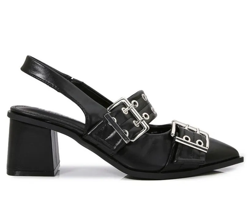 Command attention with these structured slingback heels, featuring a sharply pointed toe and oversized buckle details. The dual-strap upper gives off a refined, edgy vibe, while the low block heel adds stability without sacrificing style. Perfect for power dressing with a twist or giving everyday outfits a modern boost.
