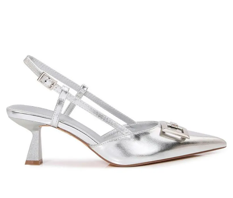 This pointed-toe slingback stands out with its T-strap design and oversized buckle embellishment. The flared mid-heel adds sculptural appeal, while the slingback strap provides a clean, feminine finish. From evening plans o polished workwear, this silhouette delivers elegance with a fashion-forward twist.