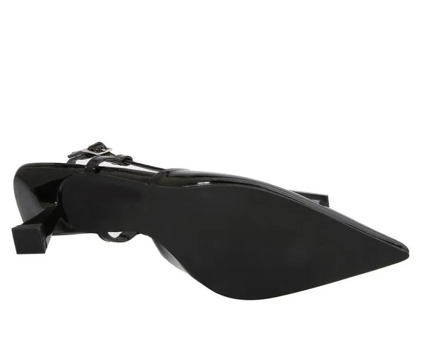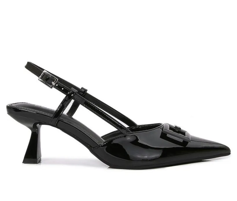This pointed-toe slingback stands out with its T-strap design and oversized buckle embellishment. The flared mid-heel adds sculptural appeal, while the slingback strap provides a clean, feminine finish. From evening plans o polished workwear, this silhouette delivers elegance with a fashion-forward twist.