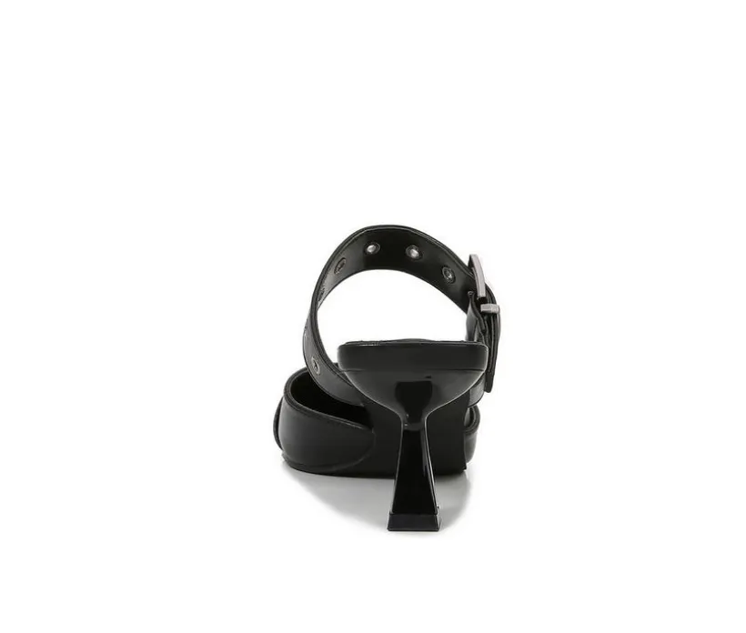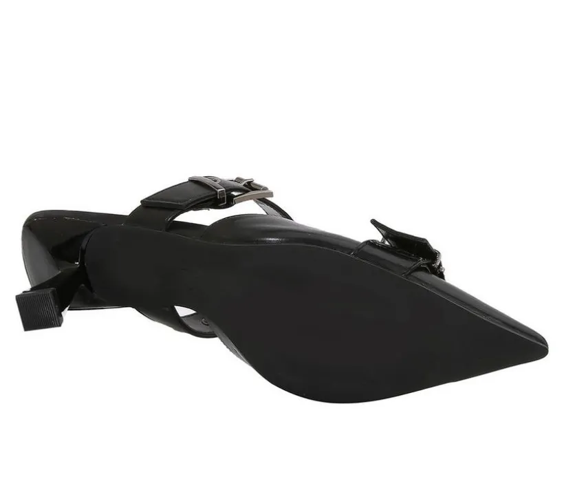 Step out with structured flair in these double-strap pointed-toe pumps, where sleek lines meet bold hardware. Designed with a sculpted kitten heel and open-back silhouette, they’re the perfect blend of minimalism and attitude. Whether paired with tailoring or denim, they deliver polished edge with every step.