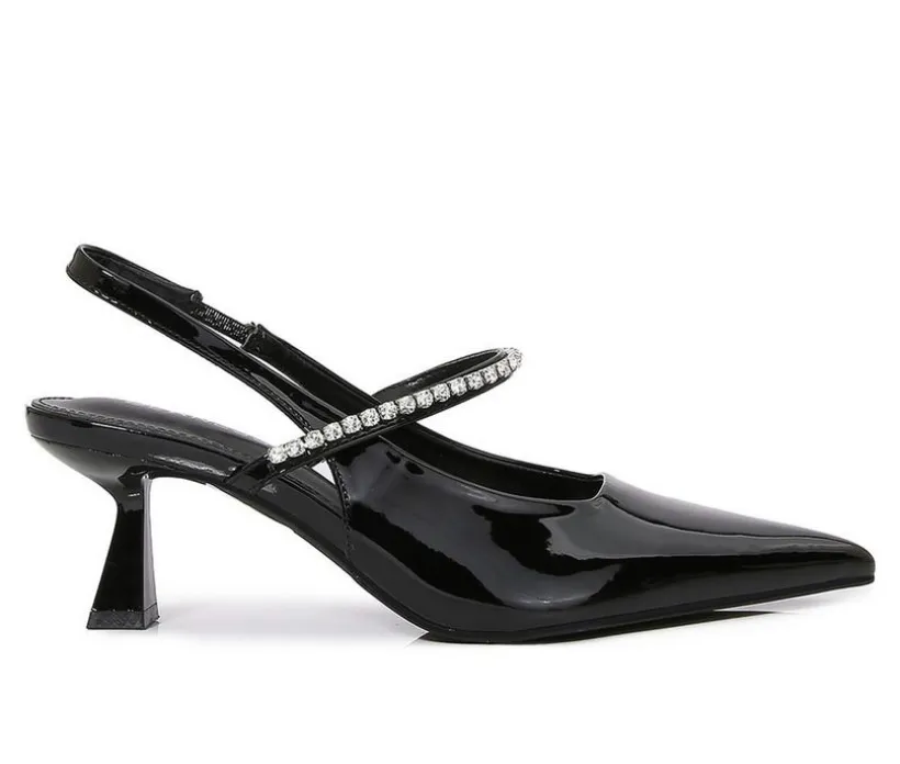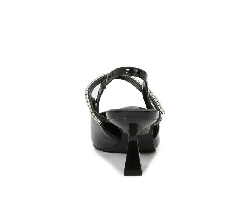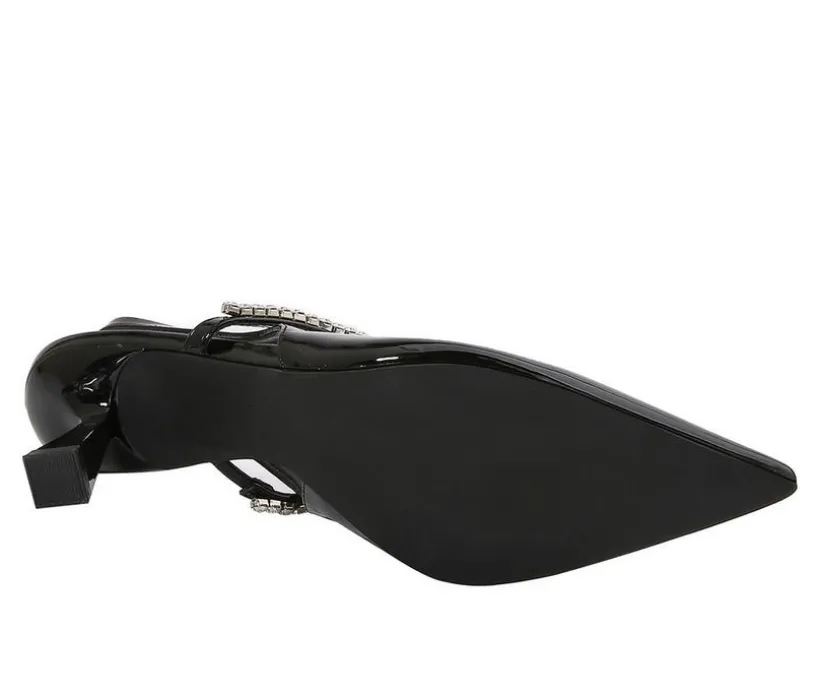 Polish your evening look with these pointed-toe slingback heels, designed to turn heads with their sleek finish and sculpted heel. A sparkling embellished strap adds just the right amount of glamour across the instep, while the low flared heel brings modern elegance and stable elevation. Ideal for dressy events or elevated everyday wear.