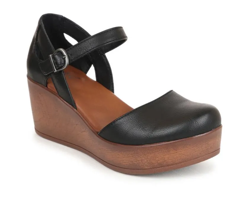 The b.ø.c. Women’s Derby Wedge Clog combines a faux leather upper with a round-toe clog silhouette and an adjustable ankle buckle strap for a secure fit. Designed with a cushioned footbed and smooth lining to support all-day comfort, this style sits atop a durable synthetic outsole with a modest platform and wedge heel that adds height while maintaining stability, ideal for casual to dress-up occasions