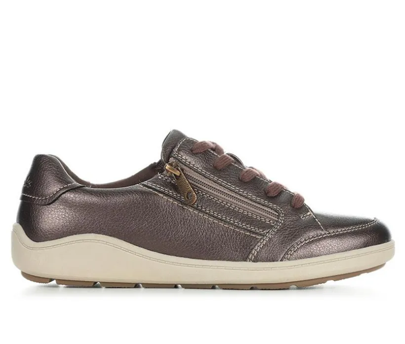 The Clarks Bryianna Bayla Sneaker is built for modern comfort with a polished finish. Designed with a metallic leather upper, it features both lace-up styling and a side zipper for easy on and off. A cushioned insole provides all-day support, while the lightweight midsole helps absorb impact with every step. Finished with a flexible rubber outsole, this sneaker blends everyday comfort with sleek, versatile style.
