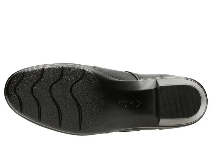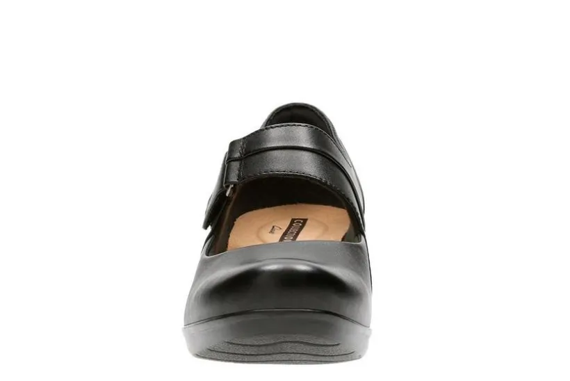 Clarks® Emslie Lulin A supple leather shoe designed for maximum comfort. A low, chunky heel boosts height without creating a challenge, and a simple hook-and-loop closure provides an easy and adjustable fit. Layers of Clarks Cushion Soft padding with an impact-absorbing OrthoLite® footbed reduce the shock of each step.