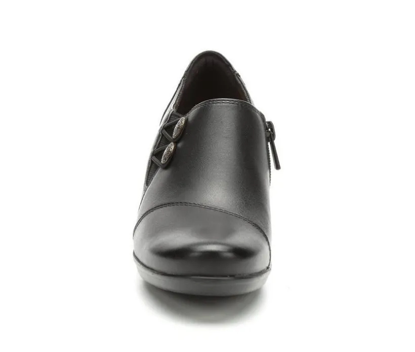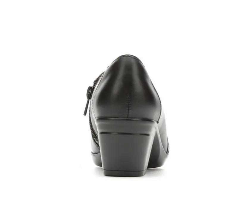 Get the style and comfort you want with the Clarks Emslie Warren! These durable heeled shoes have an easy zip-up closure, super cushioned insole, lightweight midsole, and a textured rubber outsole. The side button detail and low profile heel give you just the right amount of lift and style to wear with casual and slightly more formal looks.