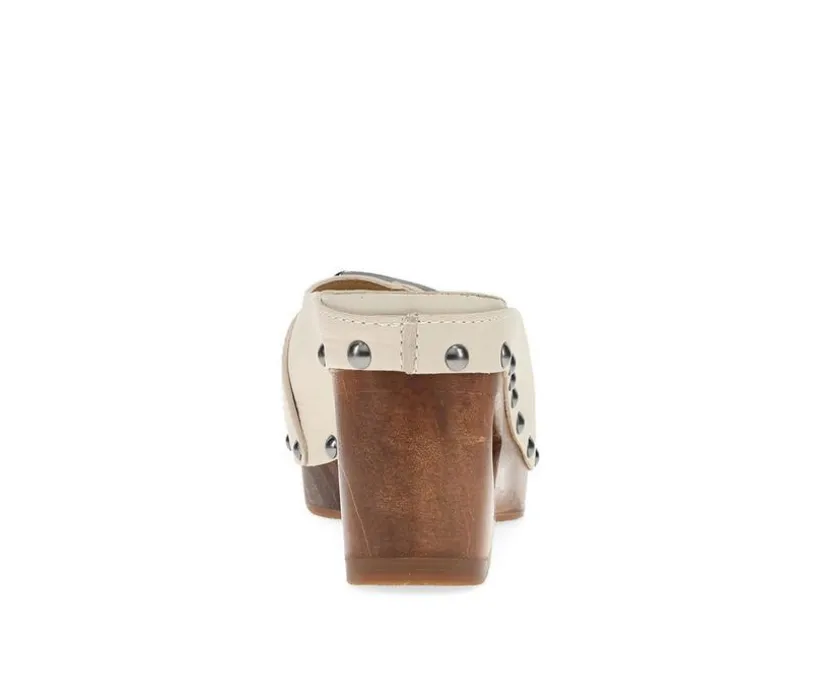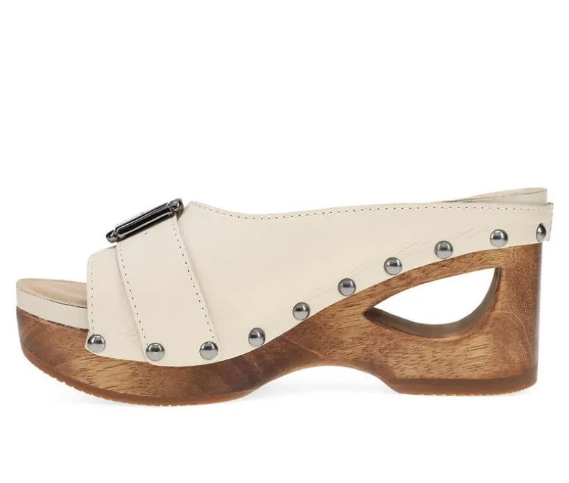 A bold platform slide with sculptural lines and edgy hardware. Featuring a leather upper with a buckled strap and stud accents, this open-toe sandal is grounded by a carved wood-look heel with cutout detailing for a retro-modern finish.