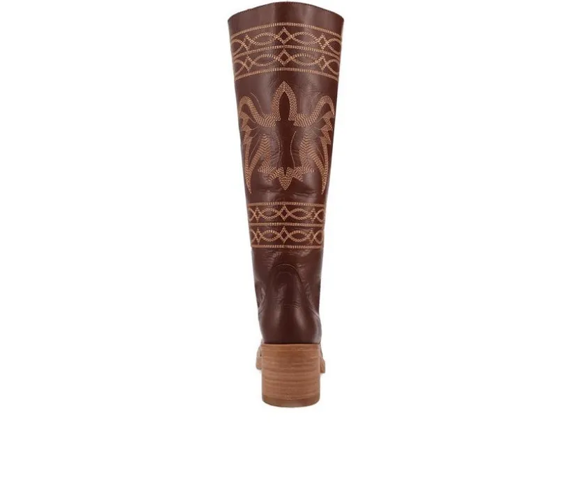 Rooted in heritage style, this tall western boot showcases bold embroidery on a structured synthetic upper. With a classic rounded toe and block heel, it blends comfort with eye-catching detail perfect for festival grounds or everyday flair.