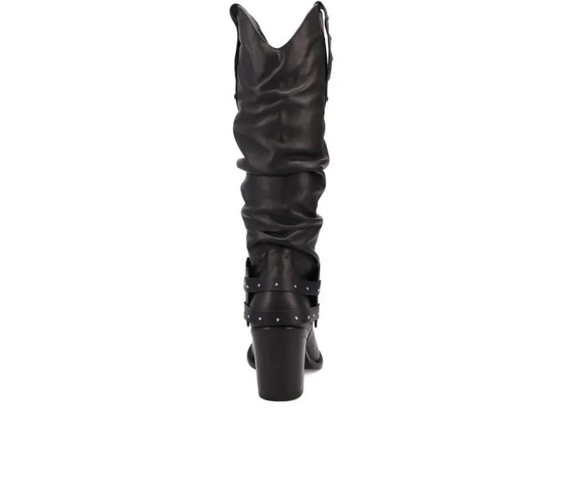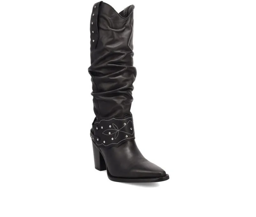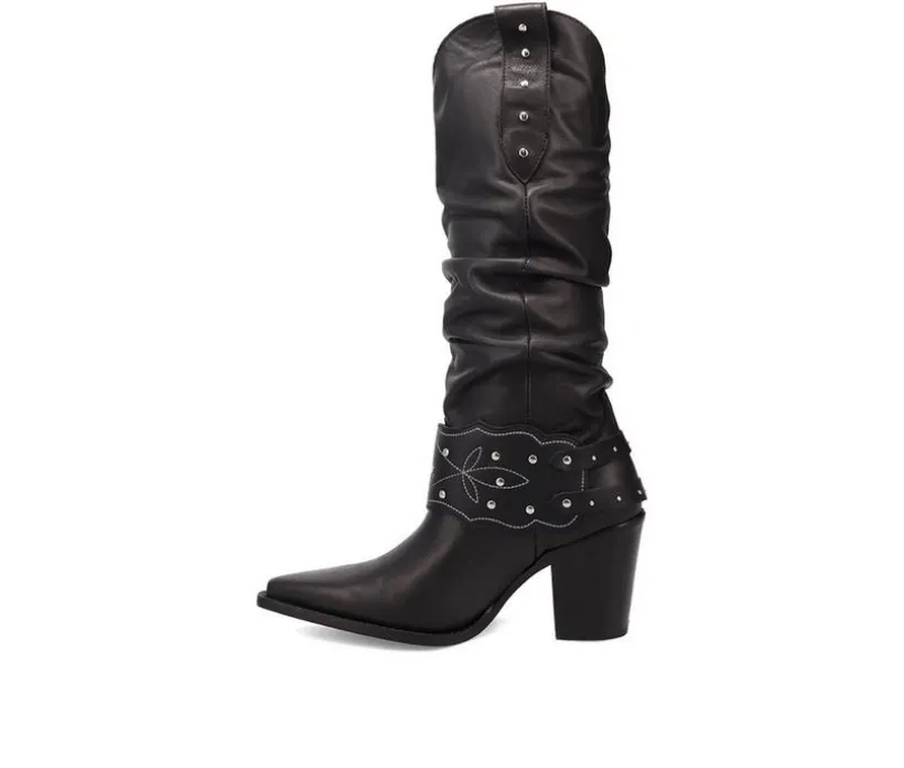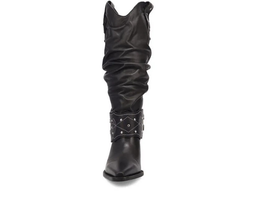 Embrace relaxed western charm with a fashion-forward twist in these slouchy cowboy boots. Crafted with a smooth synthetic upper, these boots feature soft ruching through the shaft and a studded scalloped overlay near the ankle for added detail. The pull-on design includes side tabs for easy wear, while the pointed toe and stacked block heel add a refined silhouette. Whether dressing up denim or styling a skirt, these boots bring effortless flair and comfort to every outfit.