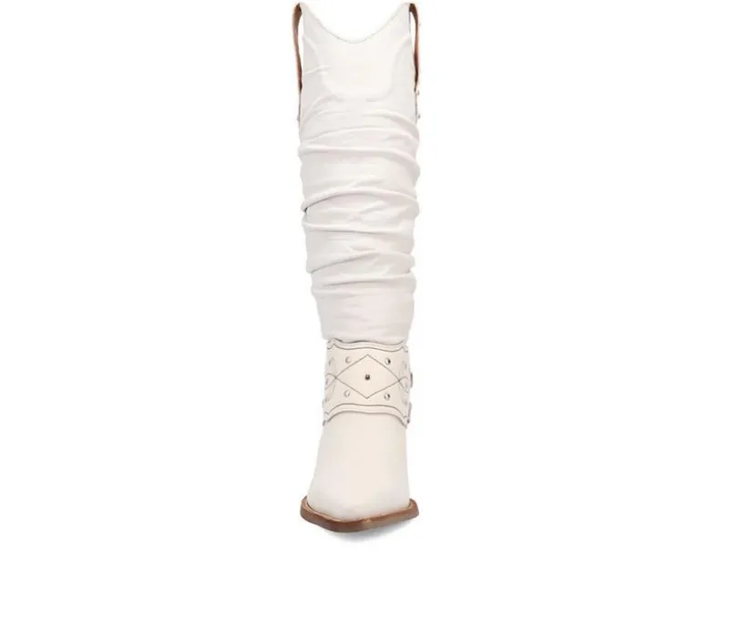 Embrace relaxed western charm with a fashion-forward twist in these slouchy cowboy boots. Crafted with a smooth synthetic upper, these boots feature soft ruching through the shaft and a studded scalloped overlay near the ankle for added detail. The pull-on design includes side tabs for easy wear, while the pointed toe and stacked block heel add a refined silhouette. Whether dressing up denim or styling a skirt, these boots bring effortless flair and comfort to every outfit.