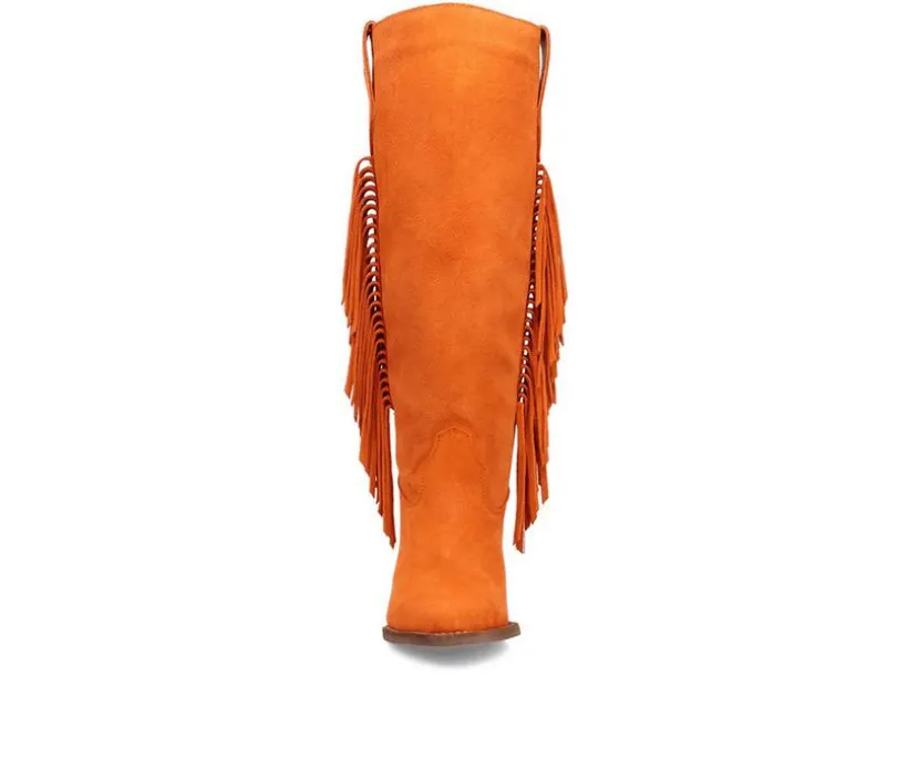 Turn heads and stir up western drama with these tall boots featuring cascading fringe and boho-inspired style. Crafted with a suede-like synthetic upper, this standout design boasts side-layered fringe that moves with every step. The pull-on construction keeps it classic, while the pointed toe and stacked block heel create a flattering, elongated silhouette. Perfect for concerts, street style, or adding flair to everyday outfits, these boots bring confidence and movement wherever you go.