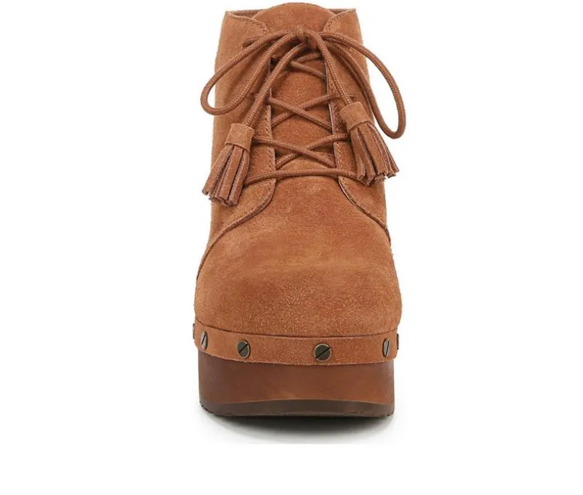 Vintage-inspired clog boots for women with forever original style. SUSTAINABLY CRAFTED: Fabric linings and topcloth partially made from recycled plastic bottles; partially recycled toe box and heel counter. MATERIALS: Suede leather upper responsibly sourced from Leather Working Group certified tanneries. FIT: Lace up closure for secure fit. SUSTAINABLE COMFORT: Anti-microbial, anti-odor Insole Technology with cushioning, comfort, & arch support that uses 15% cushy plant-based BLOOM® foam insole. MOVEMENT: Lightweight, flexible construction moves with you. STYLE: Womens lace up booties with tassel and stud detailing, round toe, 2 3/4 inch real wood heel and midsole with 1 1/3 inch platform, and rubber sole plate. 1 SHOE. 1 TREE. ALL THE FEELS: With your purchase of this shoe, we’ll donate one tree to Trees for the Future to offset carbon emissions and help impoverished families plant trees for a better life. CONSCIOUSLY PACKAGED: This style is shipped in an environmentally preferred 1-piece box made with primarily recycled materials that can be recycled & soy-based inks. Always iconic. Inspired by the wood sole sandal that started it all, these comfortable platform booties are the epitome of chic.