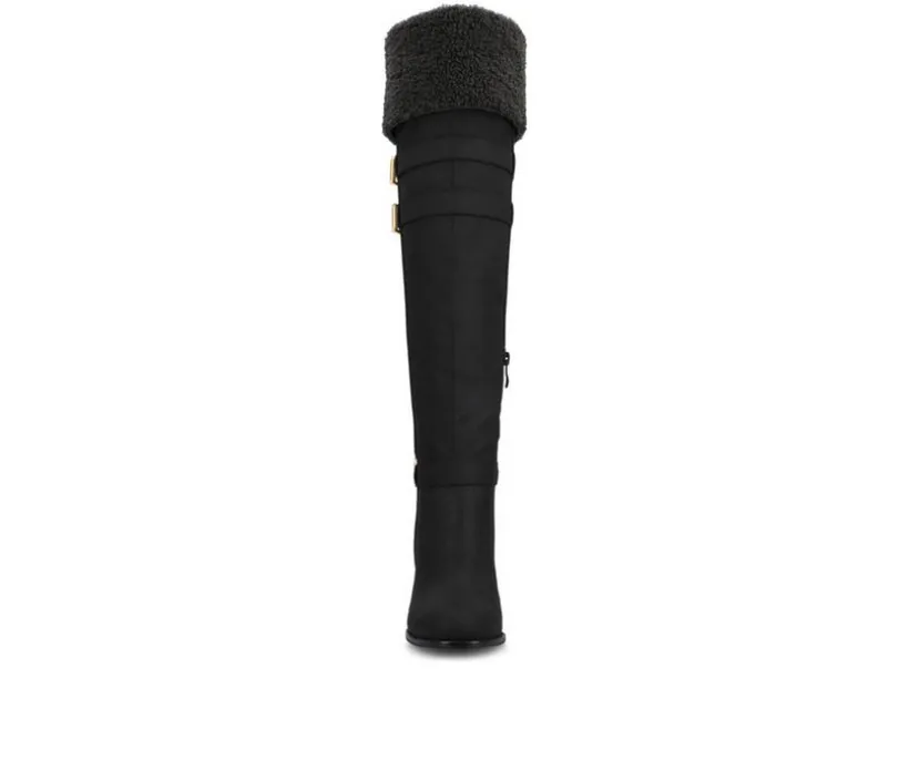Bring bold style and cozy comfort together with these over-the-knee boots designed for standout wear. Crafted with a smooth upper and finished with a plush sherpa cuff, they deliver warmth and fashion all in one. The tall shaft is accented with sleek strap and buckle details, while the sturdy block heel adds confident height. With a full-length inside zipper, these boots are easy to slip on and perfect for dressing up cold-weather looks.