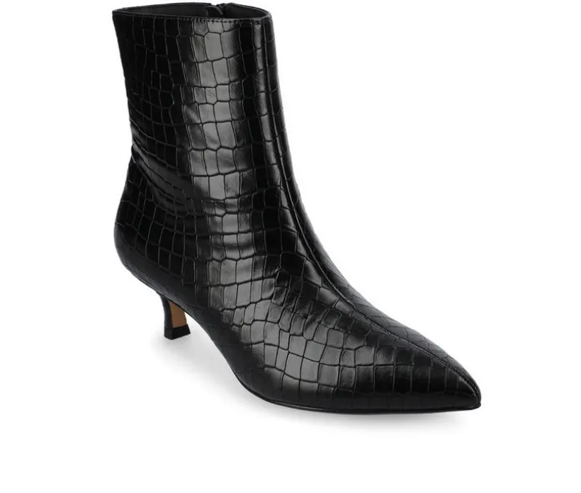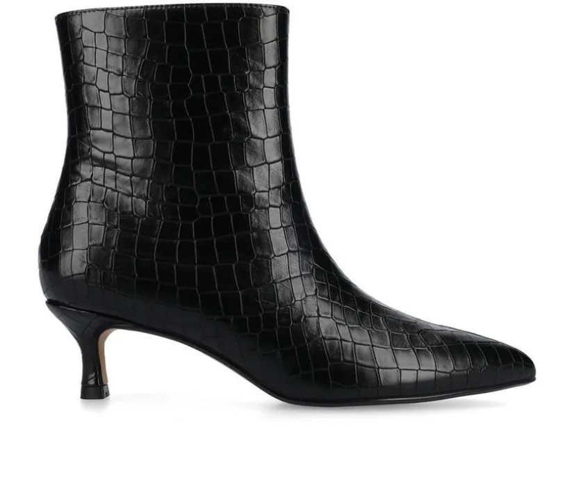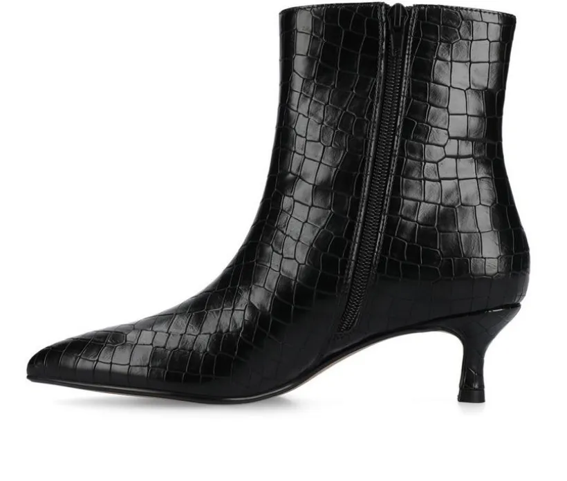 Fall fashion that has a point to make, the Arely bootie by Journee Collection. This kitten-heeled bootie is super chic thanks to the pointed toe and sleek inside zipper. Soft vegan leather and a 4 mm Tru Comfort Foam™ insole make them super comfy. At Journee Collection, our booties will give you that comfortable yet stylish look, perfect for when you’re in the office all the way to a fun night out with the girls.