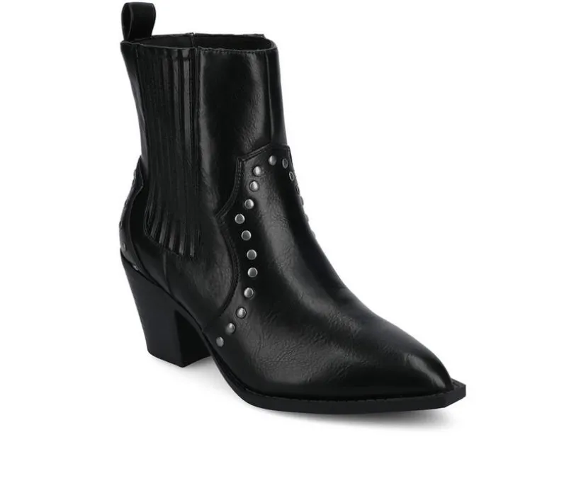 With Western flair and studded details, these booties bring bold style to your look. The pointed toe and stacked heel add a touch of edge, while the pull-on design makes them easy to slip into. A cushioned insole ensures comfort for long wear, while the sleek finish keeps them versatile. Perfect for adding a western-inspired statement to any outfit.