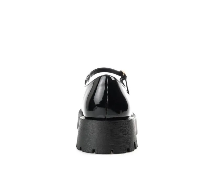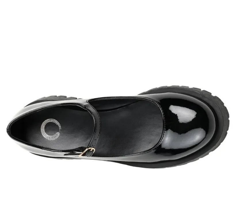 An iconic 90s style revived for the modern fashionista the Kamie flats by Journee Collection. This bold mary jane boasts glossy vegan leather uppers elevated by a chunky treaded platform sole. A round-toe and buckle detail make this statement piece an absolute classic.