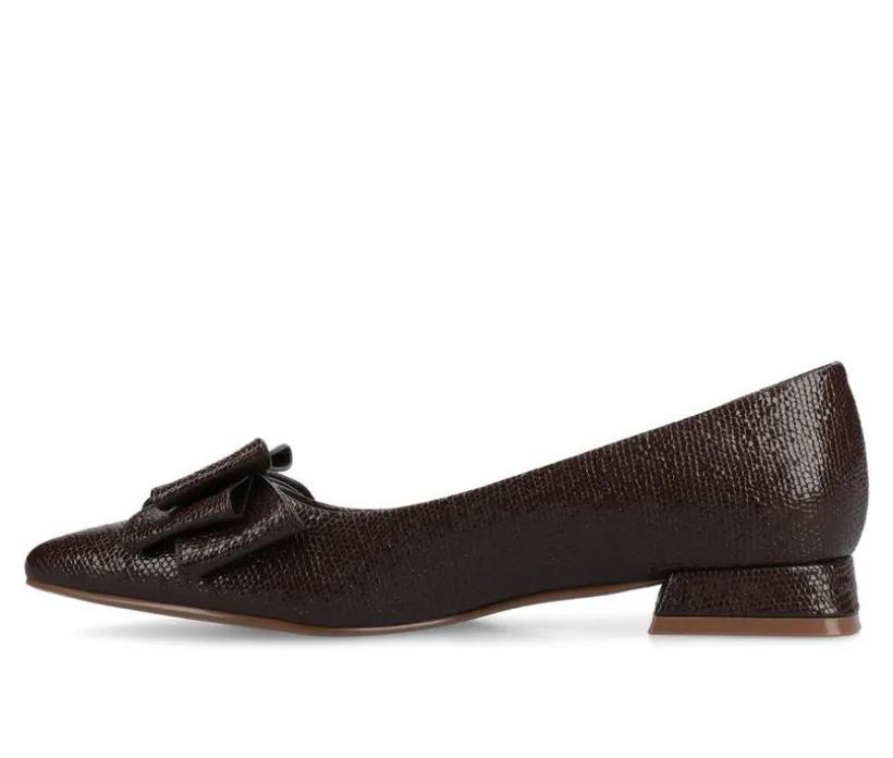 The Ophelia flat from Journee combines style and comfort with its sleek design and practical features. Crafted with faux leather uppers, these flats boast a pointed toe and a versatile 1-inch block heel. The slip-on closure, fabric lining, and 4 mm Tru Comfort Foam™ footbed make the Ophelia a chic and comfortable choice for everyday wear.