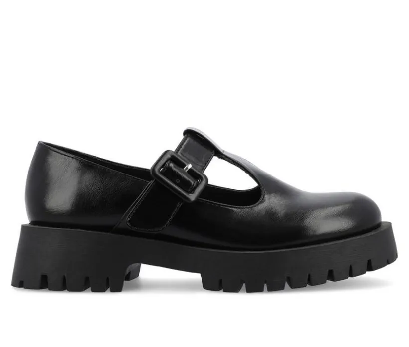 Introducing Suvi by Journee Collection, a classic flat with a twist. These 90s-style T-strap mary jane flats have a round toe and a buckle detail. Made of high-quality vegan leather, these shoes are both fashionable and easy on the feet. The 1 1/2-inch chunky treaded sole provides plenty of grip and stability, while the 4mm Tru Comfort Foam™ insole ensures all-day comfort.