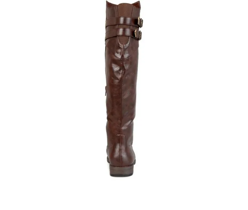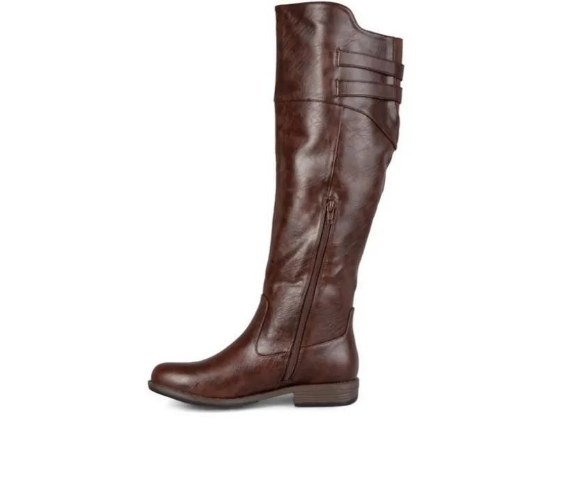 Take on the season in the chicest riding boots this year by Journee Collection. These knee-high boots highlight premium uppers that rise to the knees. Contrasting outsoles and double strap detail with buckle accents completes the look.