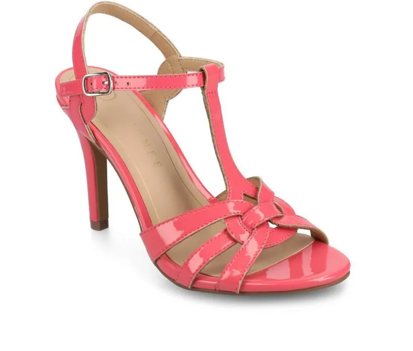 The Valry Stiletto Heel from Journee exudes elegance with its buckle ankle strap and chic woven T-strap detail, offering a sophisticated look. Crafted from smooth faux leather, it features a flattering open-toe design and a 3 3/4-inch heel for added height. A cushioned insole provides comfort, making this stiletto perfect for both style and all-day wear.