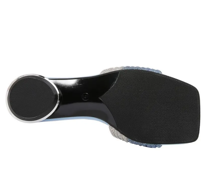 Add a pop of texture and sparkle to your warm-weather wardrobe with these standout slip-on sandals. The wide, woven upper shimmers with glittery detail, bringing playful glam to your look while keeping things breezy. A sculpted low heel wrapped in rhinestones adds eye-catching charm with every step. With an open square toe and easy-on design, these sandals strike the perfect balance of fashion and convenience for sunny days and stylish nights.