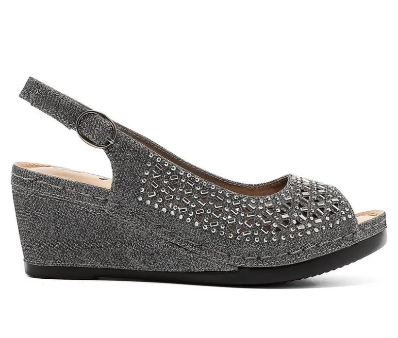 Shine through every step in these eye-catching wedge sandals designed for comfort and glamor. The upper sparkles with allover rhinestones, while an open toe and slingback strap keep things breathable and secure. A wedge heel adds a flattering boost without sacrificing stability, making them perfect for everything from casual celebrations to formal nights out. With an adjustable strap and cushioned insole, these sandals offer a personalized fit and easy wear that lasts all evening.