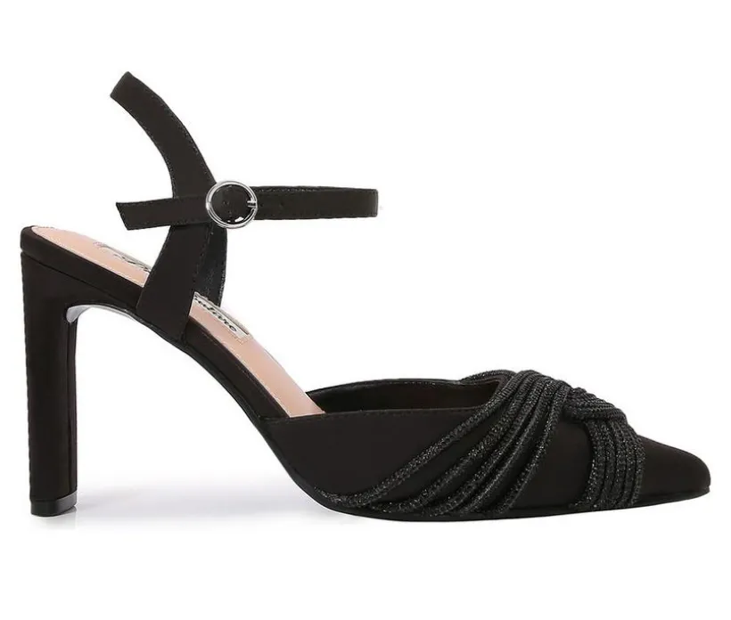 This elegant heel brings glamour and sophistication to every special occasion. A pointed toe and structured silhouette create a sleek, dressy profile, while sparkling woven accents wrap across the vamp in a refined knotted design. The supportive ankle strap keeps your foot secure atop the block heel, giving you the confidence to move with ease and grace. From evening galas to formal celebrations, this shoe offers timeless beauty with modern sparkle.