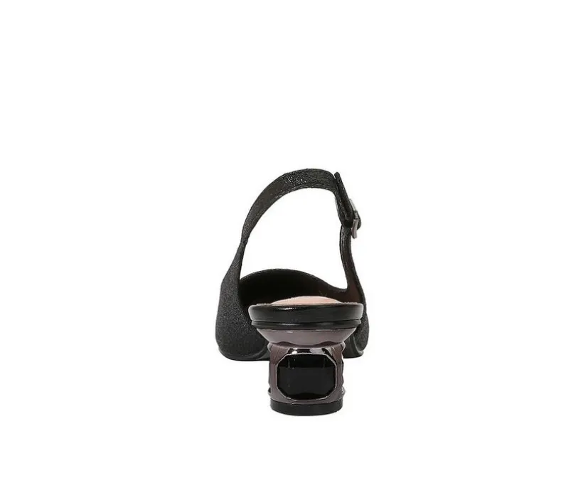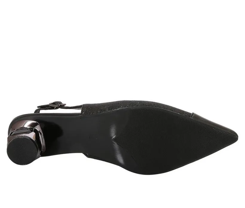 Bring runway flair to your evening ensemble with these dazzling heels that redefine statement style. A glittery upper with a glossy pointed toe commands attention, while the sculpted heel embedded with gems delivers bold personality from every angle. The slingback design offers a secure fit with an adjustable buckle, combining elegance and edge in one refined silhouette. Perfect for formal events or a night out, these heels are made to sparkle and impress.