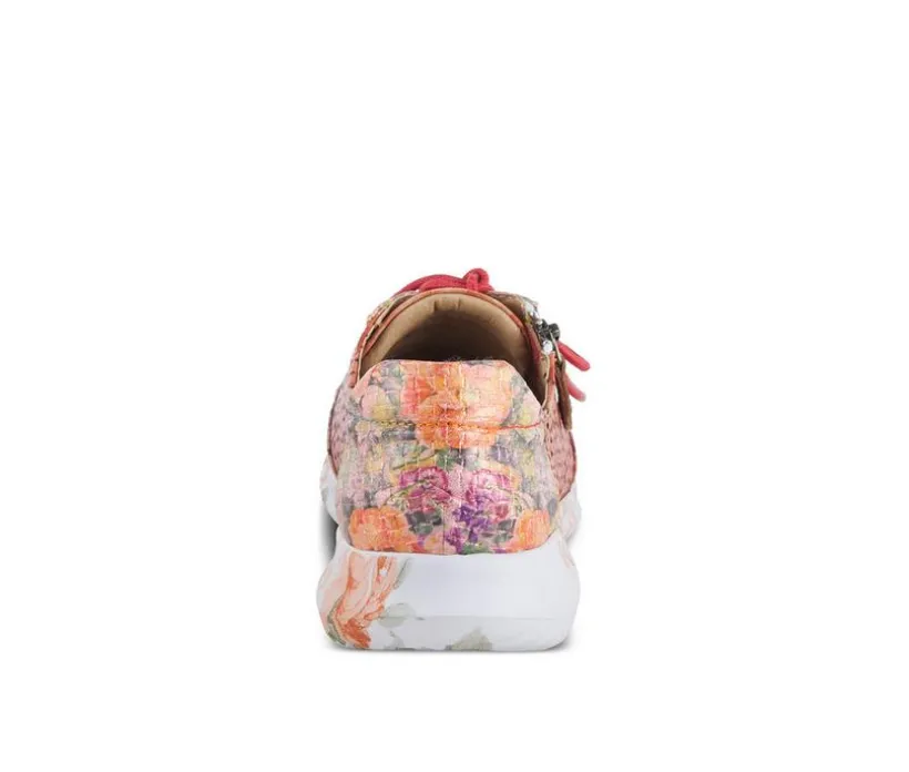 L’Artiste Style: JAZZIE. A lightweight sneaker that will put a spring in your step. This sneaker style casual has leather laser circle cutouts, lace up straps and a beautiful faux leather metallic pattern that matches a fun floral print on the outsole. The gentle wedge slope offers not only a lift but the ultimate in all day comfort. Upper: Genuine and man-made leather combination. Lining: Synthetic. Insole: Synthetic. Outsole: Rubber. Closure: Lace-up. Heel Height: 1.25″. Wedge Height: 3/4″. Features: Adjustable, Comfort, Hand-painted, Removable Insole. Disclaimer: L’Artiste products are made with natural tanned leather using traditional hand painting techniques. This unique finishing process is used to create a natural effect with color variations to deliver authentic look and beauty.