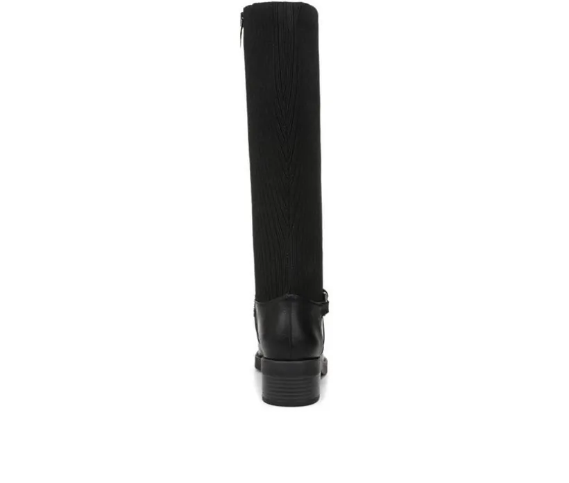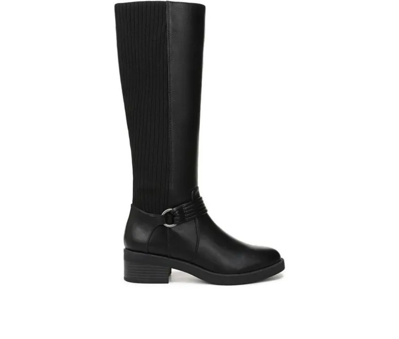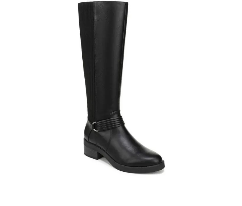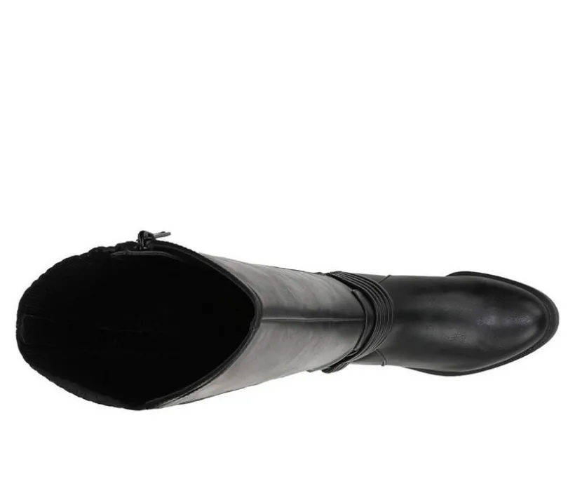 A refined take on a classic tall boot, this style blends sleek design with everyday comfort. Crafted with a faux leather upper, round toe, and a decorative strap with metallic ring detail, it’s both versatile and polished. The stretch knit back panel ensures a flexible fit, while the inside zipper makes it easy to slip on and off. Soft System® comfort technology delivers cushion and support, and the traction sole keeps every step steady atop a 1 3/4″ block heel.