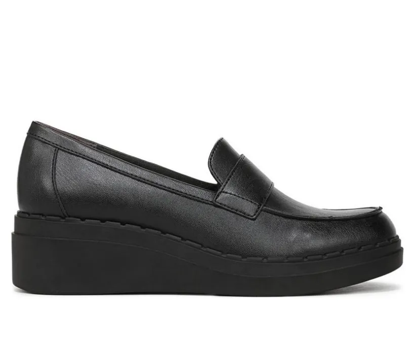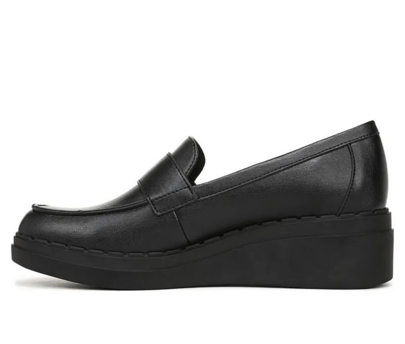 This sleek wedge loafer combines timeless style with elevated comfort, offering a polished look that transitions effortlessly from work to weekend. The glossy synthetic upper features classic loafer styling with a wide vamp strap, while the cushioned insole provides supportive wear throughout the day. A low wedge heel delivers subtle lift without compromising stability, and the rounded toe adds to its versatile appeal. Whether you’re dressing up or keeping things casual, this loafer adds a refined finish.