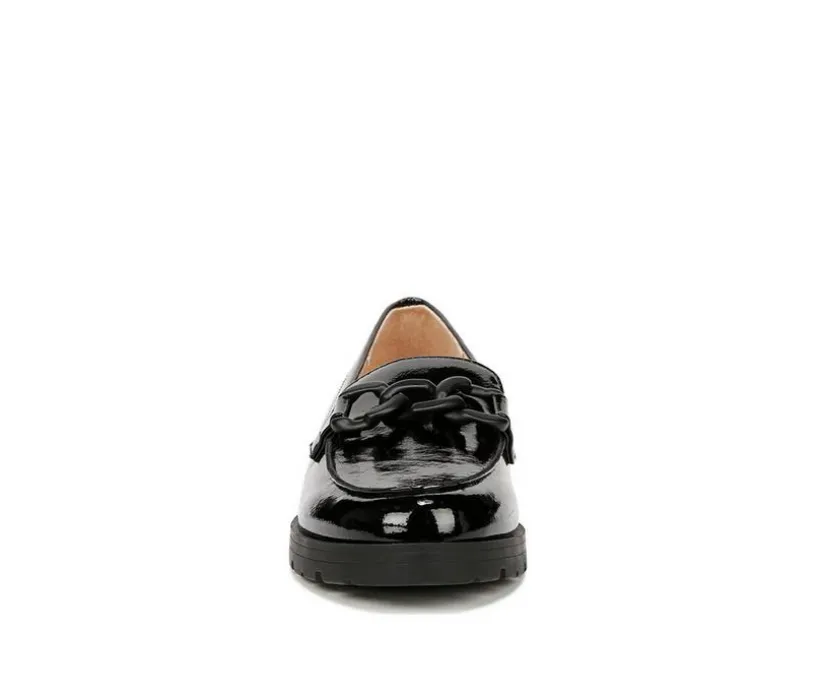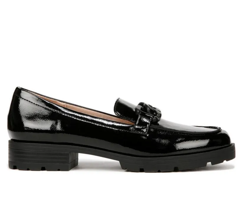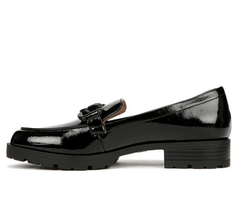 Step into timelessness. A casual loafer with a modern chain link accent belongs in your cart and on your feet. Faux leather upper with a rounded toe, slip-on fit, enamel chain link ornament, and lug sole. Linings, toe box and heel counter partially crafted with recycled materials. Soft System® comfort package provides all-day support, flex, and cushioning. Traction sole for extra stability. Just Right Height 1 1/4 inch block heel.