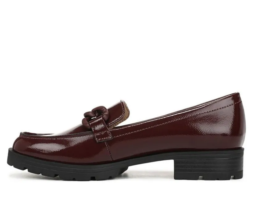 Step into timelessness. A casual loafer with a modern chain link accent belongs in your cart and on your feet. Faux leather upper with a rounded toe, slip-on fit, enamel chain link ornament, and lug sole. Linings, toe box and heel counter partially crafted with recycled materials. Soft System® comfort package provides all-day support, flex, and cushioning. Traction sole for extra stability. Just Right Height 1 1/4 inch block heel.