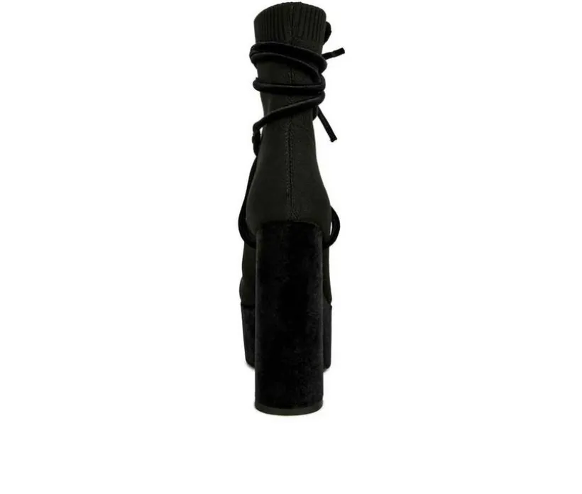 The one turning heads – this high-heeled bootie has cut pile velvet detail at the bottoms and a flexible knitted upper. Slides easily into feet, the high platform adds to the height cutting strain off toes. The tie-up detail is trendy and makes the booties fit snuggly!