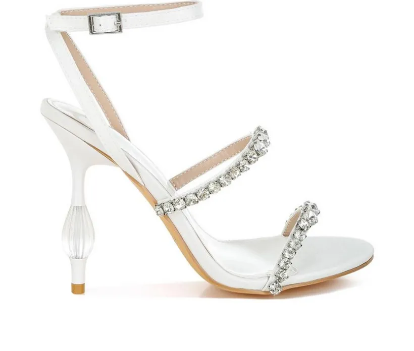 A dazzling dress heel with sculptural flair and elegant sparkle. Featuring a faux satin upper with rhinestone-trimmed straps and a delicate ankle buckle, this open-toe sandal is lifted by a decorative stiletto heel with a unique orb-like accent for elevated evening looks.