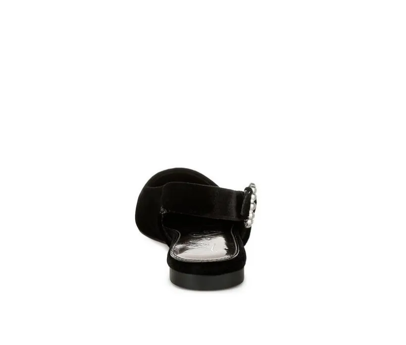 A luxe-looking flat with evening appeal, this velvet slingback features a pointed toe and rhinestone-trimmed buckle. The cushioned insole and low profile keep it wearable from reception to last dance. Elegant, fuss-free, and ready for dressy occasions.