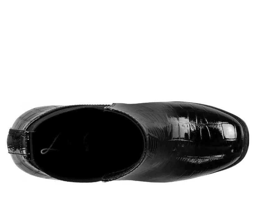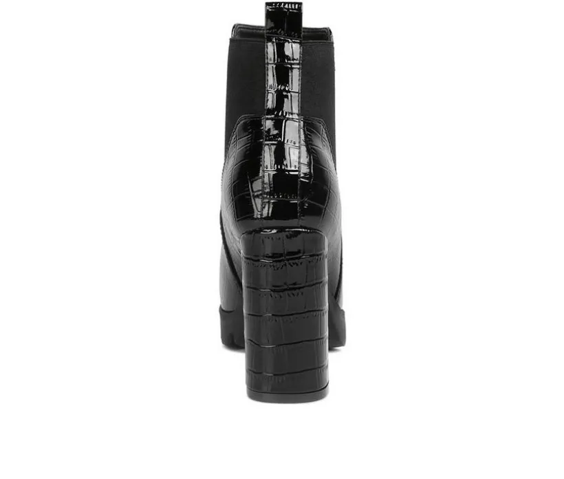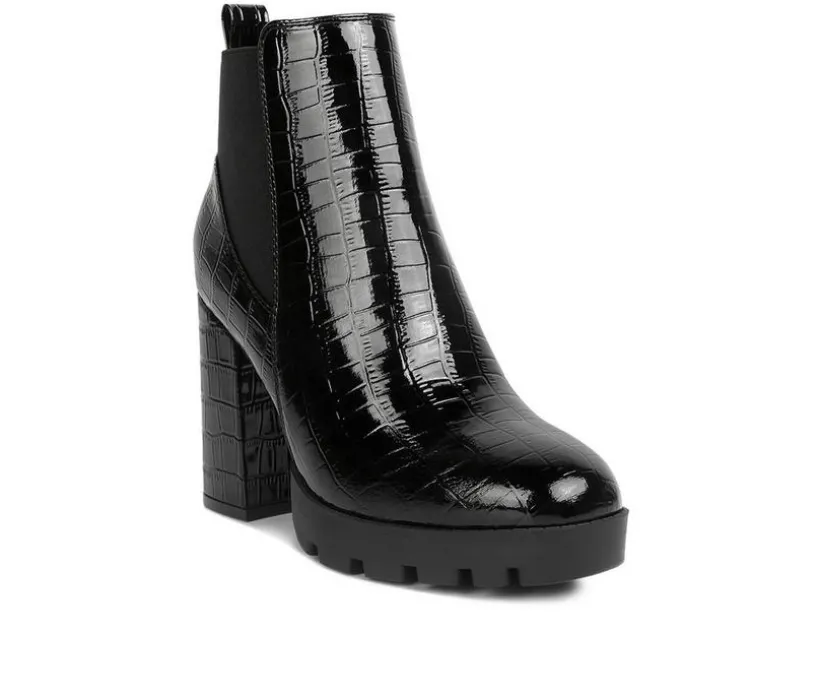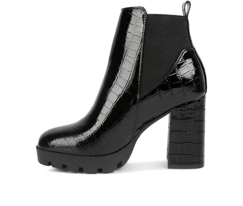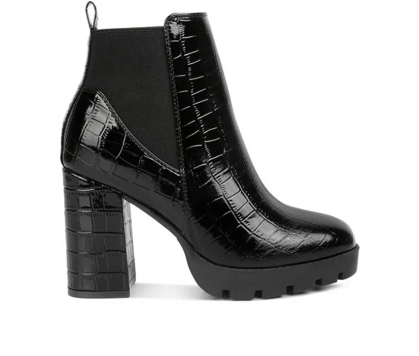 Boots with croc texture are a stylish and edgy footwear option that combines the classic appeal of sleek boots with the unique texture and pattern of crocodile skin. The boots come with chunky blocki heel that also features the crocodile texture. And include elastic gusset on both sides making it easier to wear them.