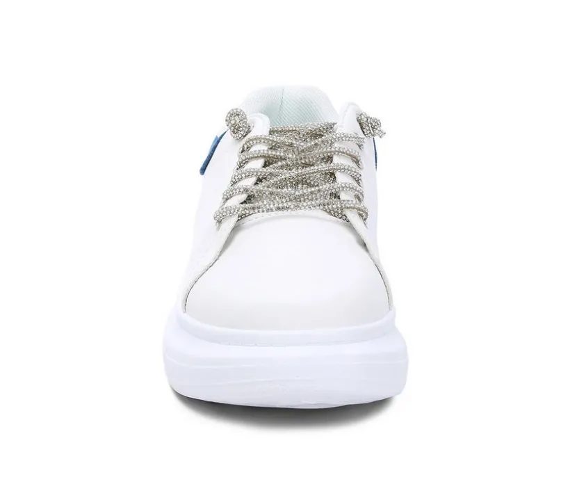 The chunky sneakers exhibit an enigmatic aura with the rhinestones embellished laces and tongue and the exaggerated chunky soles. The shoes are sure to amp up your fit with the eye-catchy bling and boldness and give a relaxed fit with the light cushion insoles.