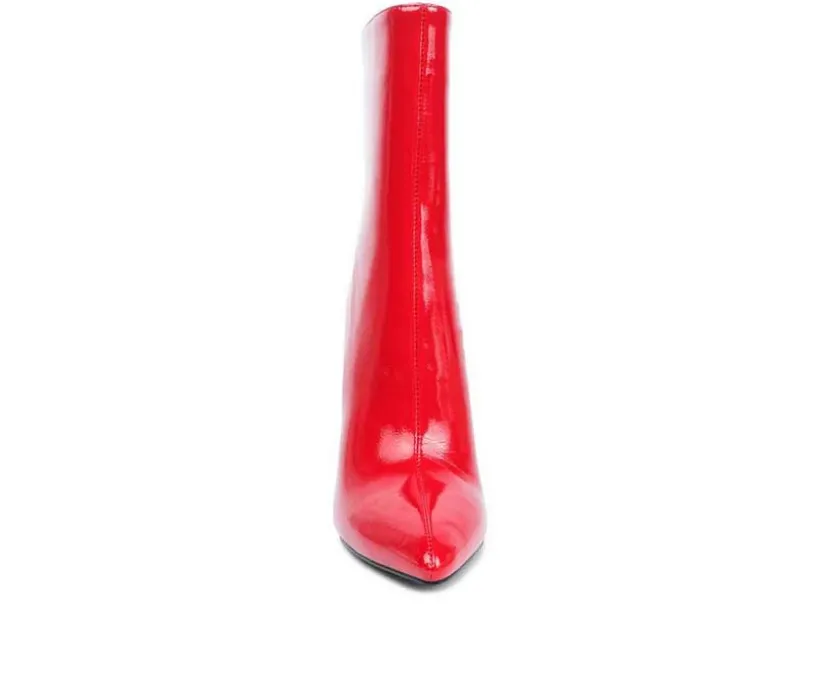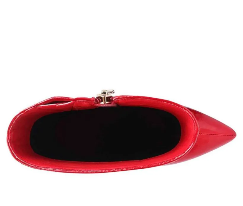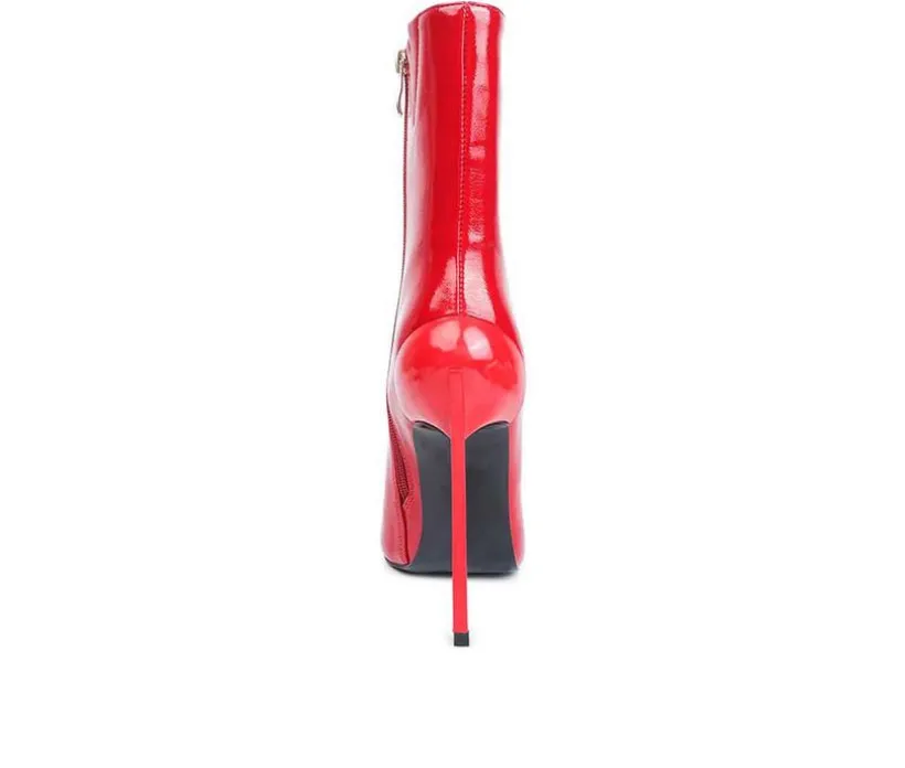 Sharp and bold: high pointies in patent PU are stunners! The high heeled ankle boot comes with pointed toe, structured heel cap and elegant aesthetic. It has elasticated Gussets which make it fit well, the side zipper facilitates