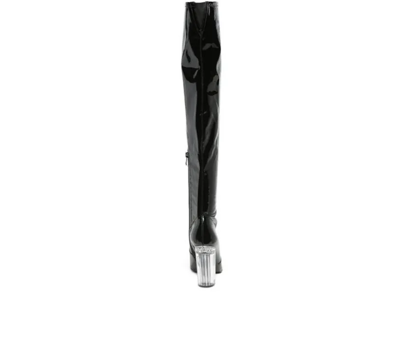 With clear block heels – this pair of patent PU thigh high boots scream style all way round. The pointed toe beauties seem to add some spark to grey winter moods.